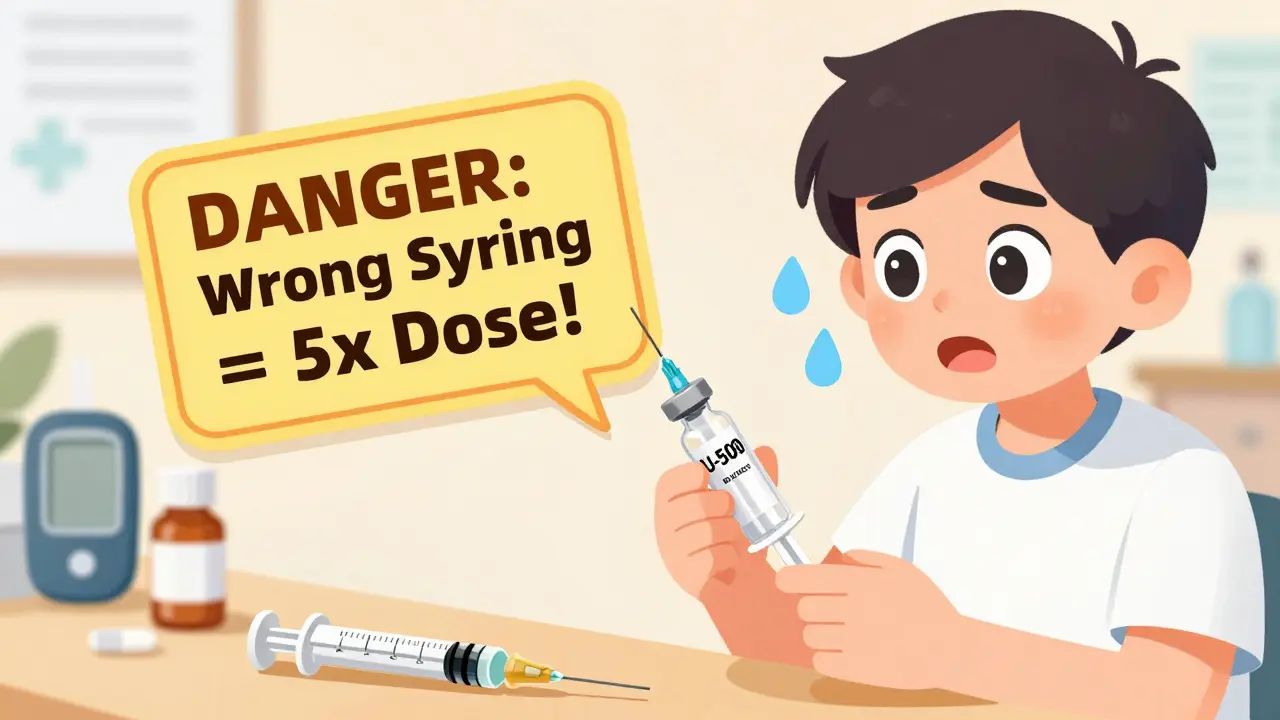 Not all insulin is the same. Most people use U-100 insulin-that’s 100 units per milliliter. It’s the standard. But some people with severe insulin resistance need U-500, which is five times stronger. If you use a U-100 syringe to draw up U-500 insulin, you’re giving yourself five times the dose you think you are. That’s not a typo. That’s a medical emergency.U-100 insulin contains about 34.7 micrograms of insulin per unit. U-500? Each unit is roughly 36 micrograms, but because it’s packed five times denser, you need a special syringe labeled for U-500. Mixing them up isn’t just risky-it’s deadly. Always check the vial label. If it says U-500, don’t use a regular syringe. If you’re unsure, ask your pharmacist. There’s no room for guesswork.