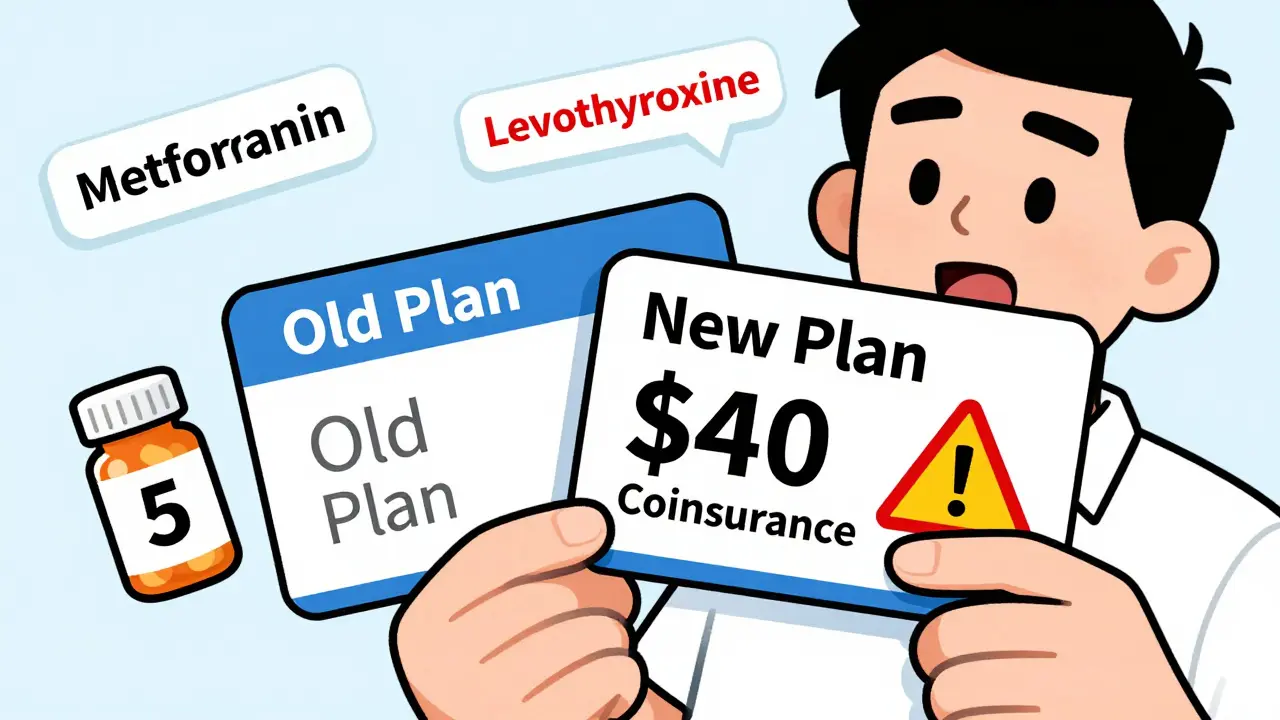 When you switch health plans, your monthly premium isn’t the only thing that changes. Your generic drug coverage might look the same on paper-but it could cost you hundreds more each year if you don’t check the details. Many people assume all generics are treated equally, but that’s not true. A $3 copay for metformin in one plan could become a $40 coinsurance in another-even if it’s the exact same drug. And if you take multiple prescriptions, those differences add up fast.