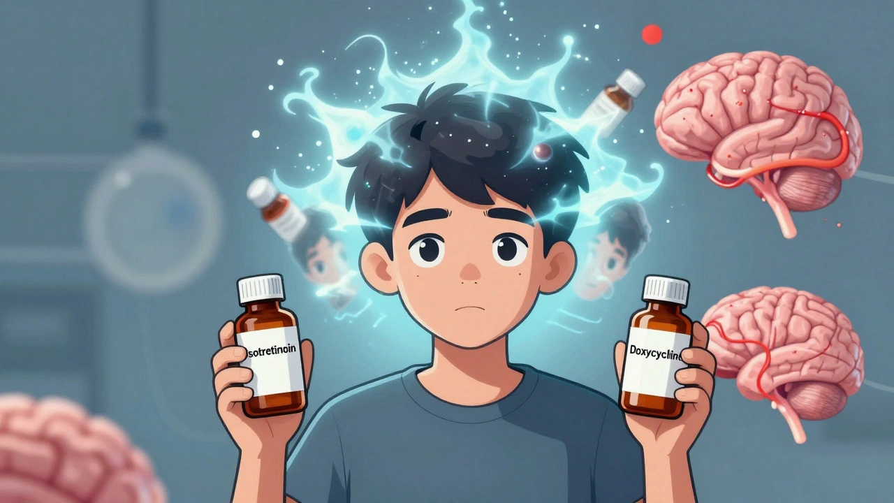 Two common acne treatments - tetracyclines like doxycycline and isotretinoin (brand names like Claravis or Amnesteem) - are safe on their own. But together? They can trigger a rare but devastating condition called pseudotumor cerebri, which mimics a brain tumor and can steal your vision before you even realize something’s wrong.